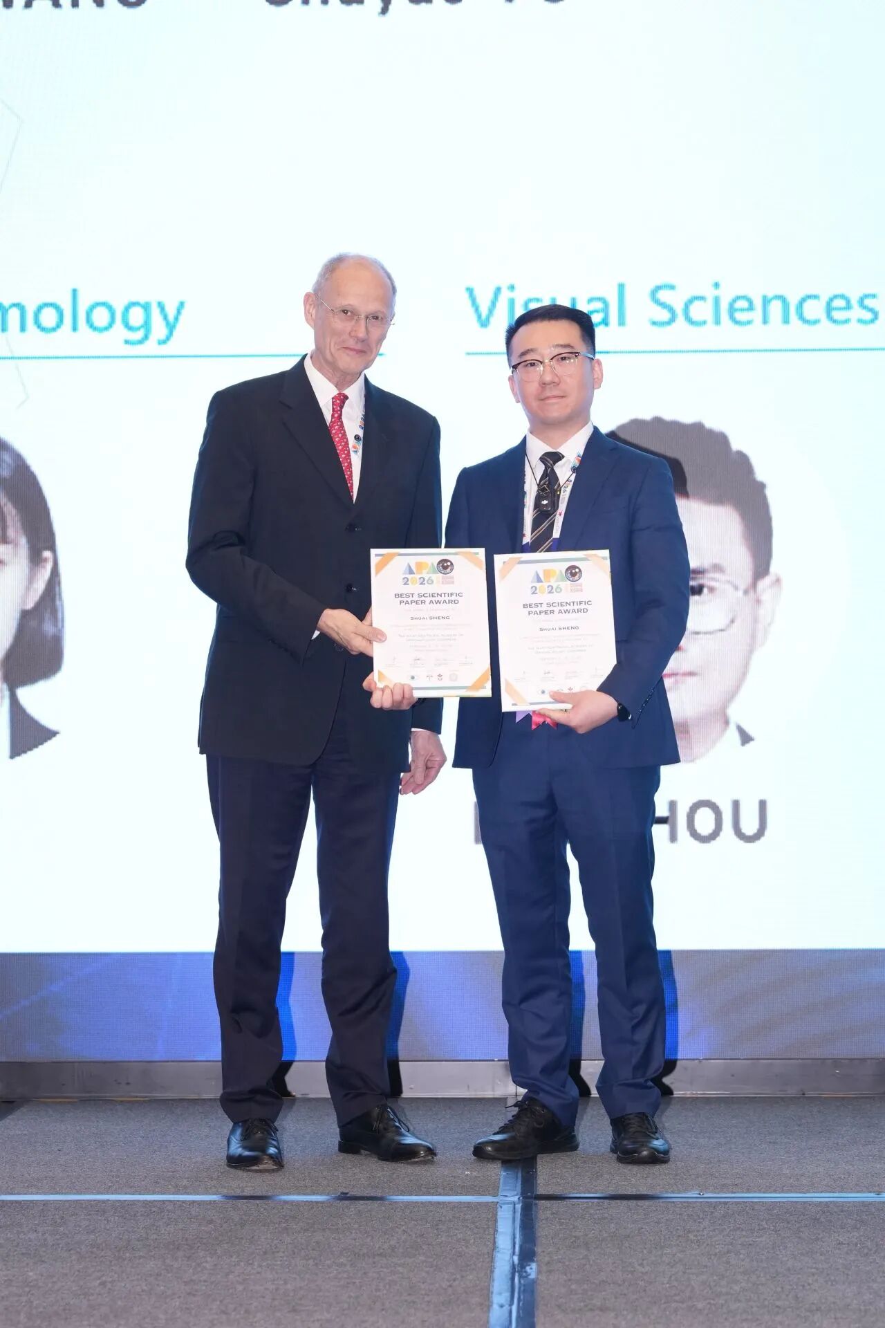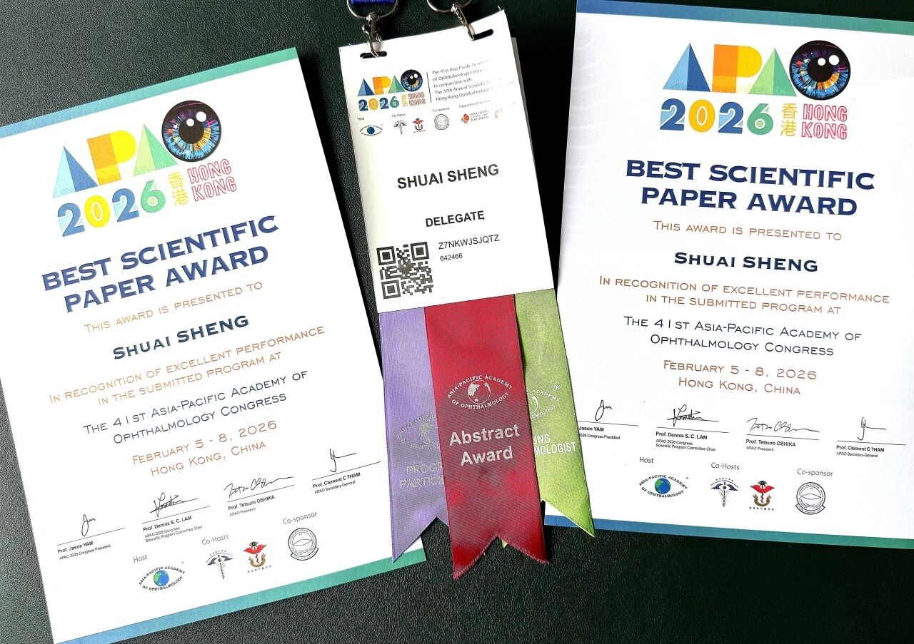 其中,盛帅博士的研究成果尤为突出。其提交的两篇学术论文,从全球7000余篇优秀投稿中脱颖而出,在大会上进行了报告分享,双双荣获大会最高荣誉之一的 “APAO最佳科学论文奖”(APAO Best Scientific Paper Award)。